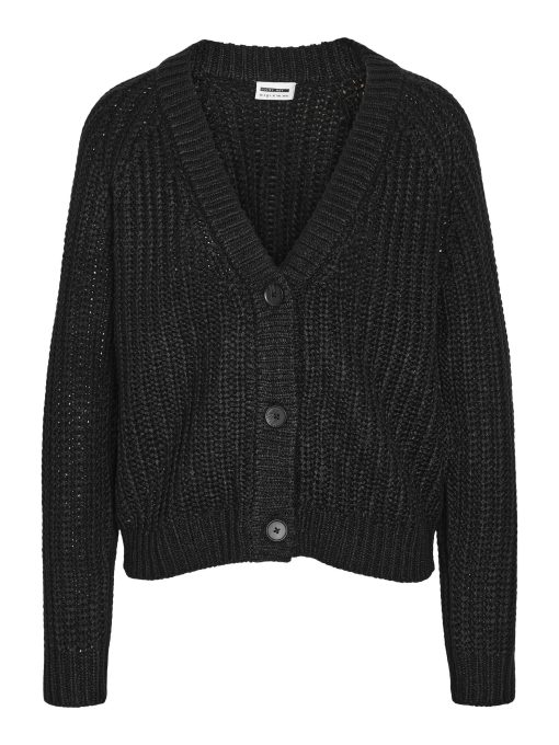 – Knitted cardigan – Button fastenings through front – V-neck – Long sleeved – Ribbed neckline, hem and cuffs- Relaxed fit