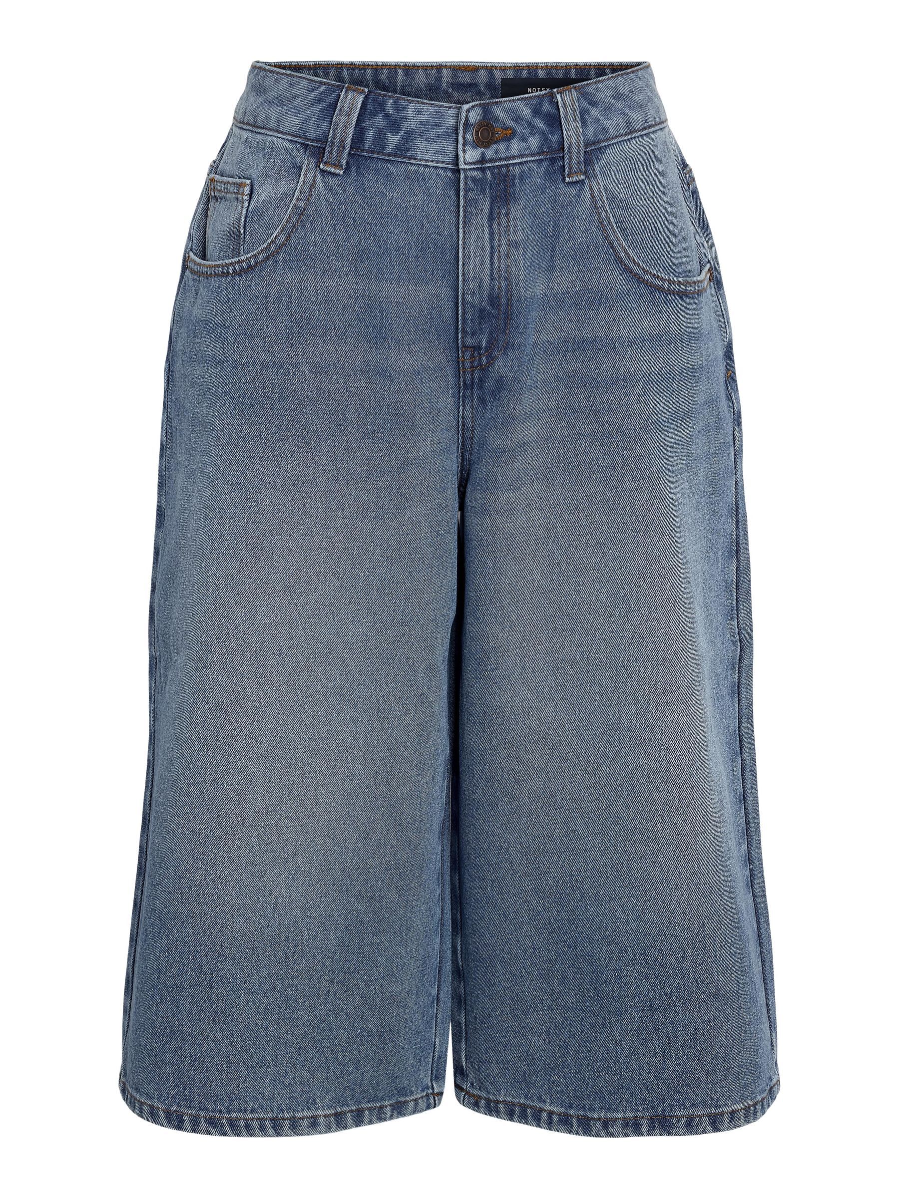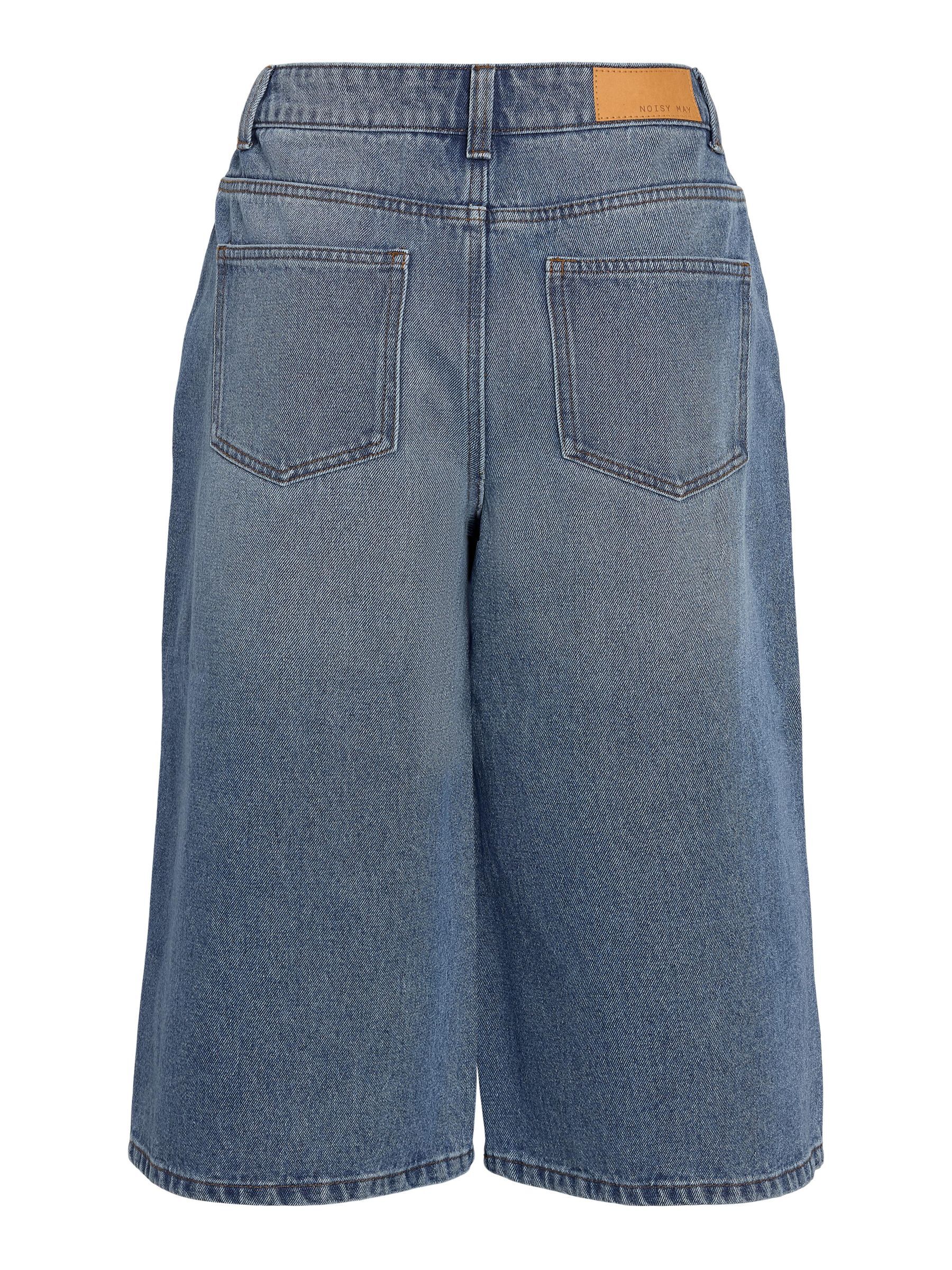 – Long denim shorts- Normal waist with belt loops- 5-pocket design- Jacron patch- Zip fly with rivet button fastening- Faded effect- Loose fit
