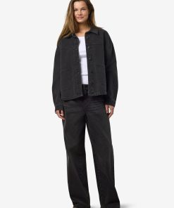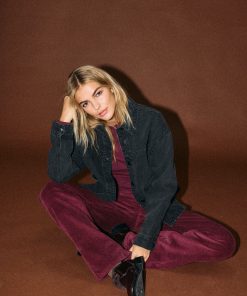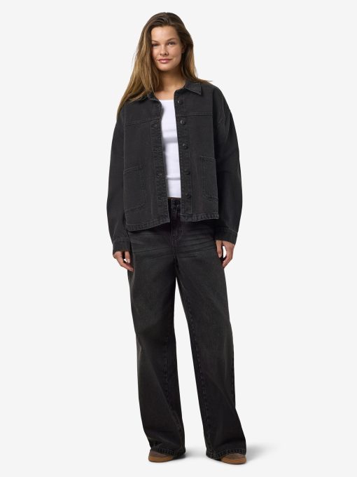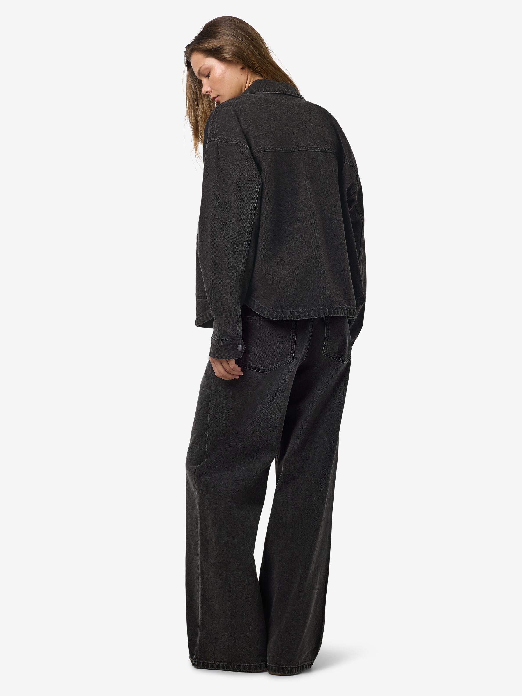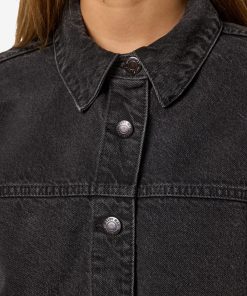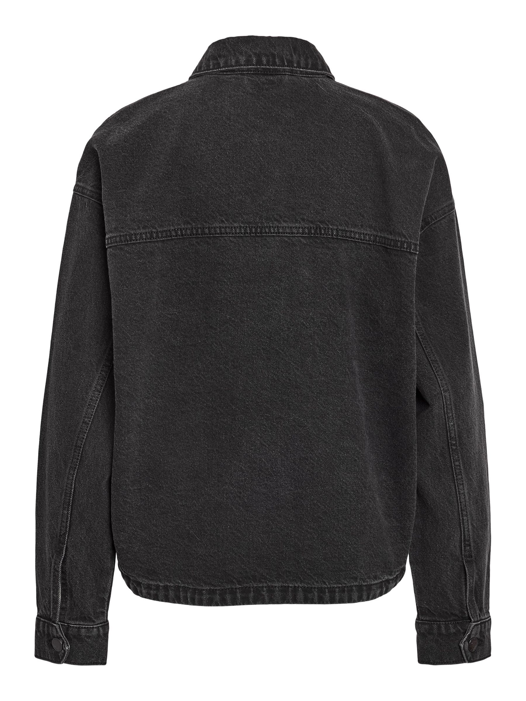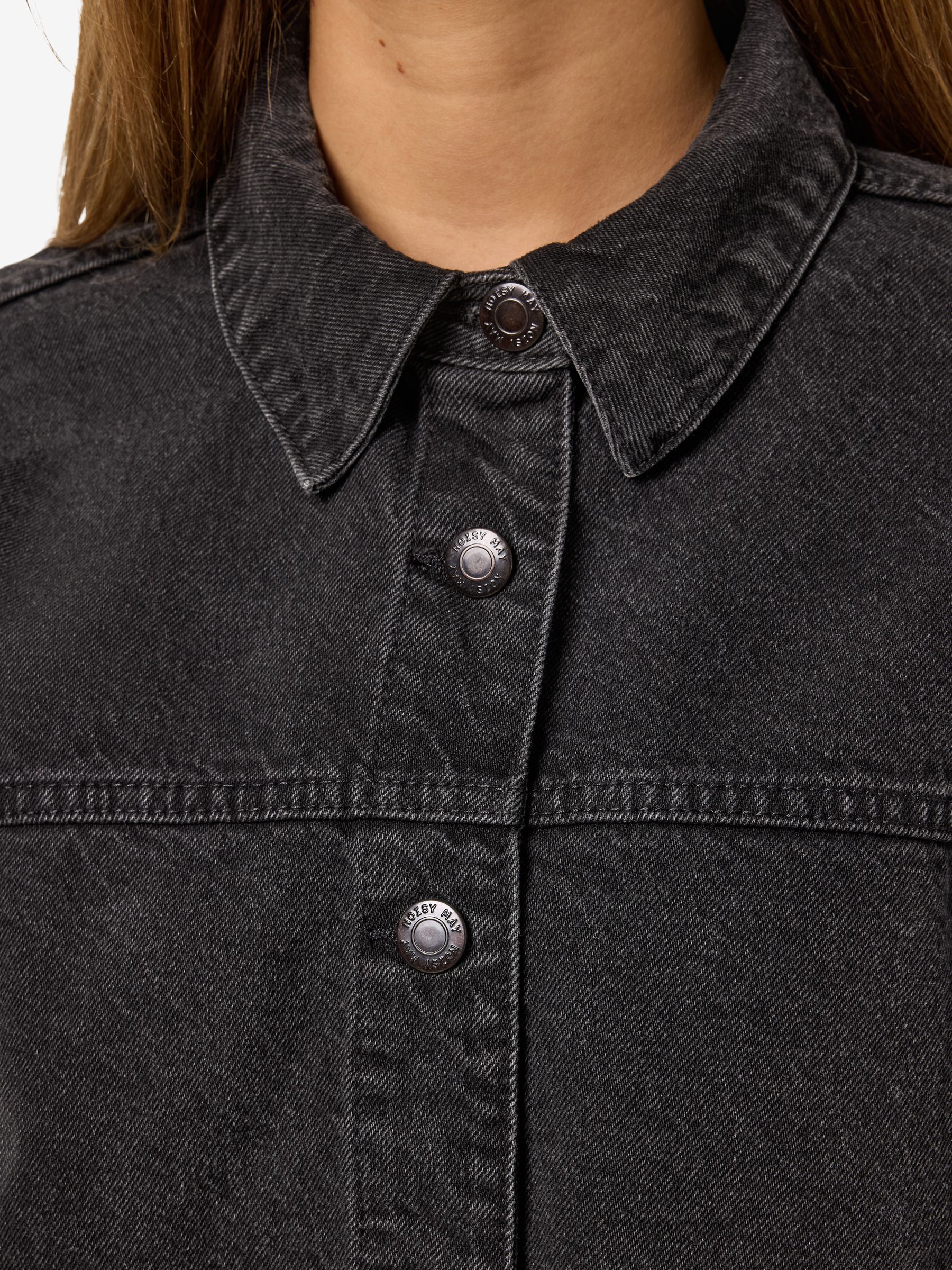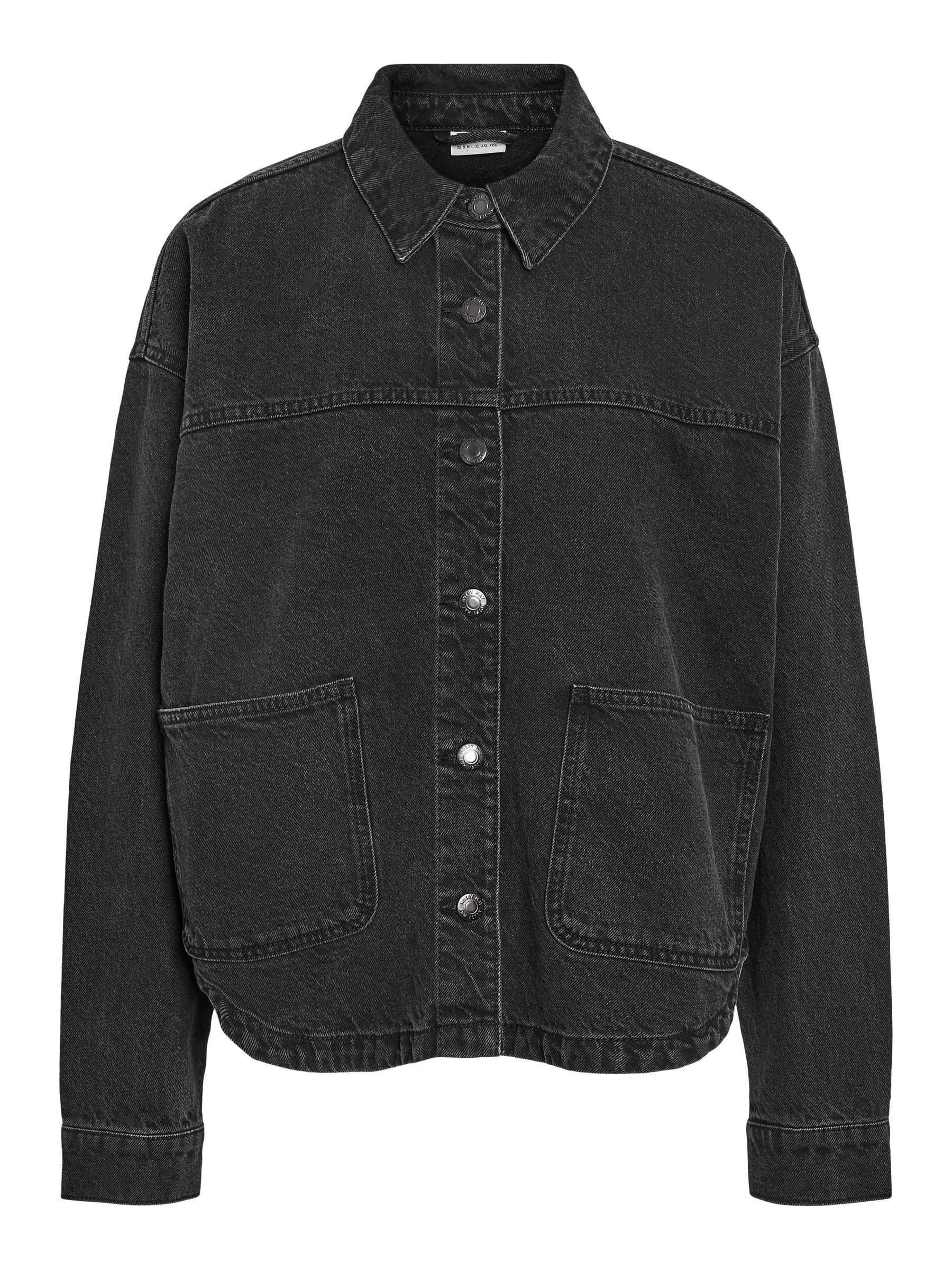 – Long sleeved denim jacket- Pointed collar- Dropped shoulders- Long sleeve with buttoned cuffs- Button-up front- Front patch pockets- Curve hem- Relaxed fit- Model is wearing size M